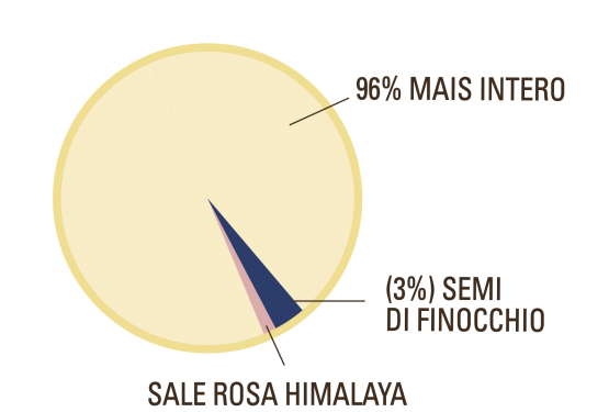 I semi di finocchio lasciano al palato un aroma fresco e asciutto, conferendo una nota aromatica che può essere percepita come lievemente amara e piccante mentre il sale rosa dell'Himalaya aggiunge una nota sapida e minerale. Il nostro mais pregiato completa il sapore, creando un contrasto piacevole di croccantezza, friabilità e rusticità.